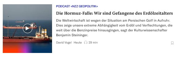 Link zur Gesamtserie »NZZ-Geopolitik« hier Link zur Sendung »Die Hormuz-Falle« hier